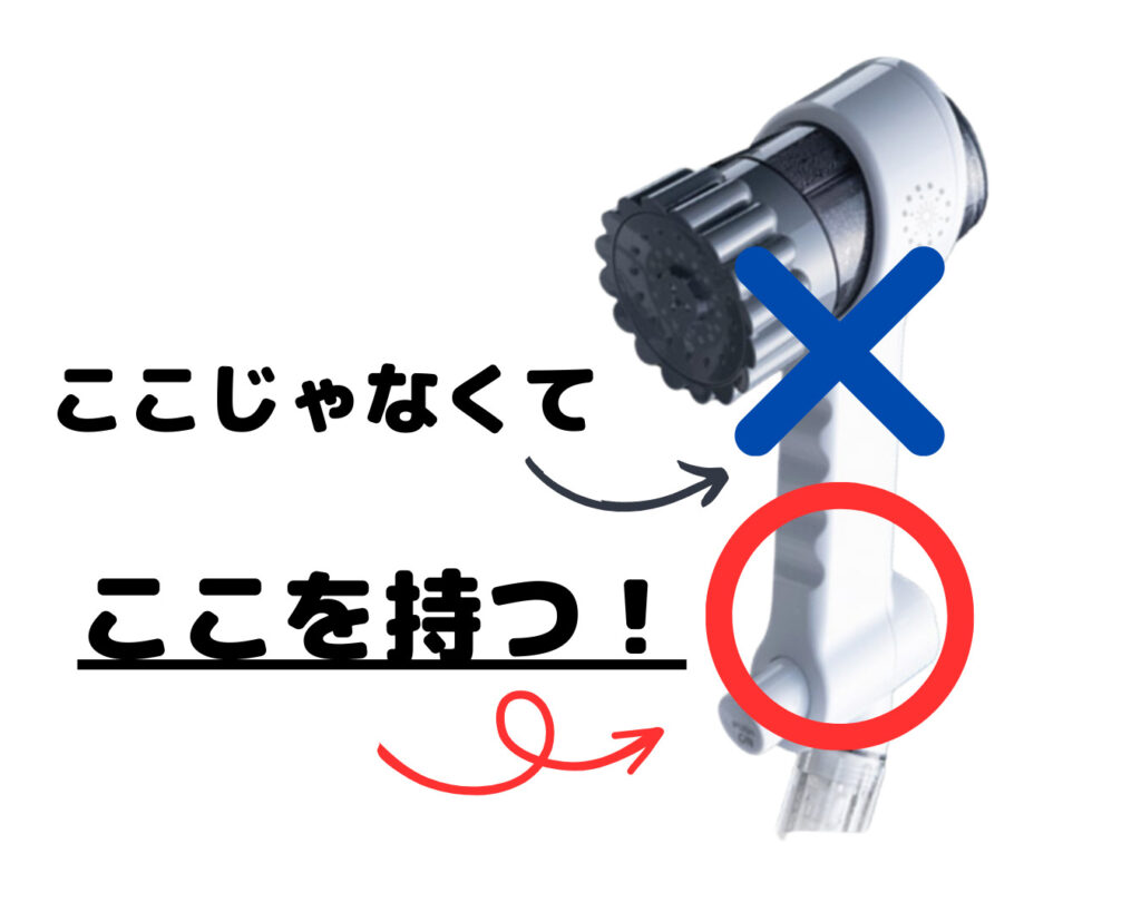 シャワーヘッドを持つ時はヘッドに近い部分じゃなくて、ホースに近い部分を持つと○