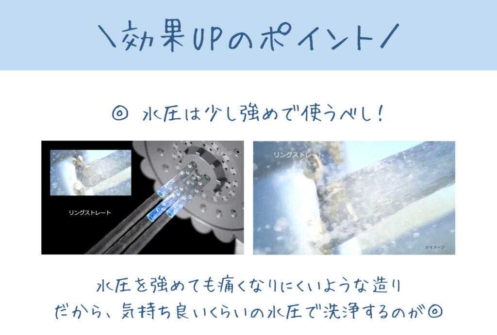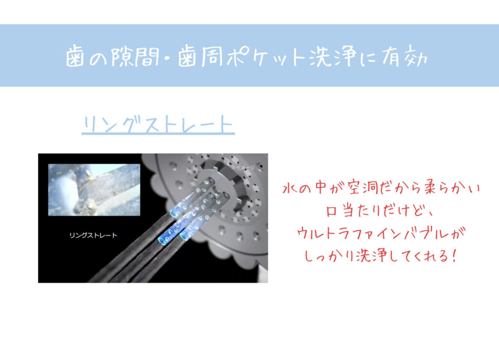 歯の洗浄をするときは、【リングストレートモード】にして、普段より気持ち水圧強めで使うのがおすすめ!