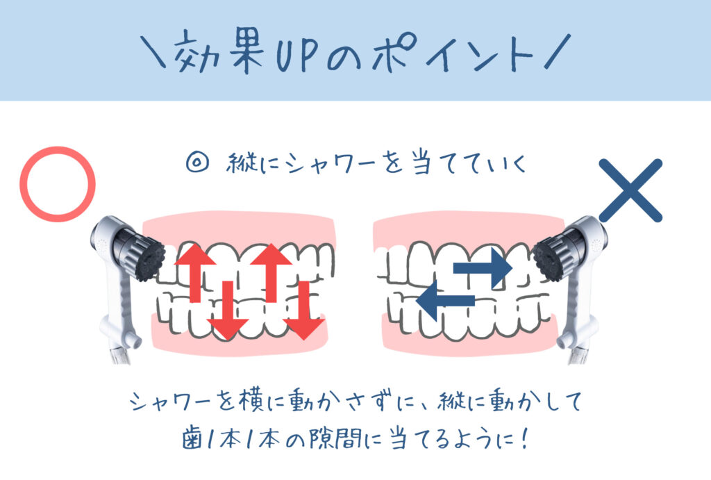 細菌は特に歯周ポケットに入り込んでいるので、歯周ポケット目掛けてシャワーを当てることと、舌にもミストを当てて洗浄するとなお良いです。